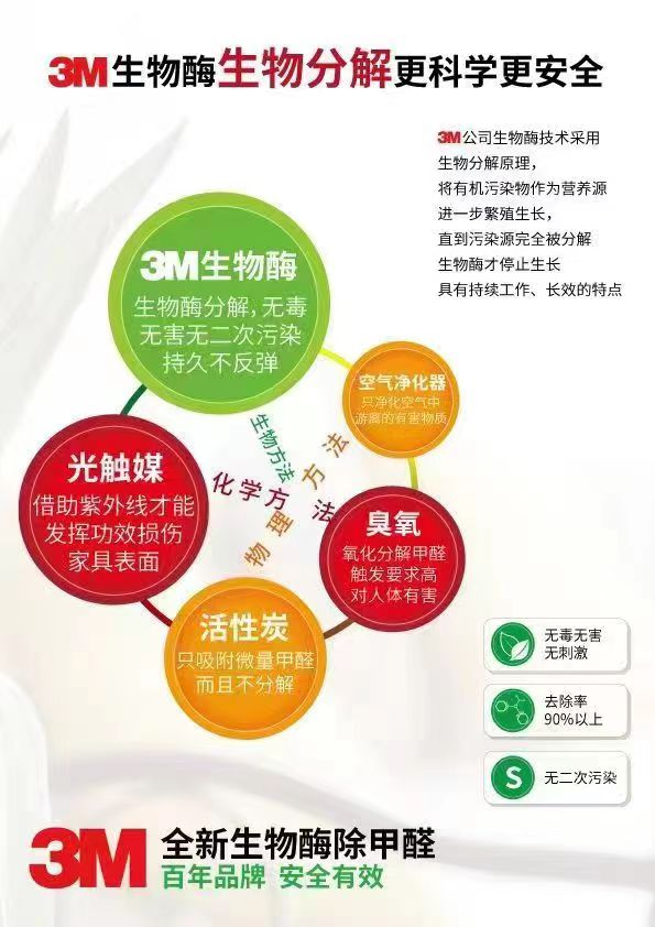 3M生物酶除醛的专利技术,对比光触媒,或者其他吸附类除醛技术,更加安全无害,对幼儿、孕妇、老人,都十分友好。也不会对家具家装带来损伤。