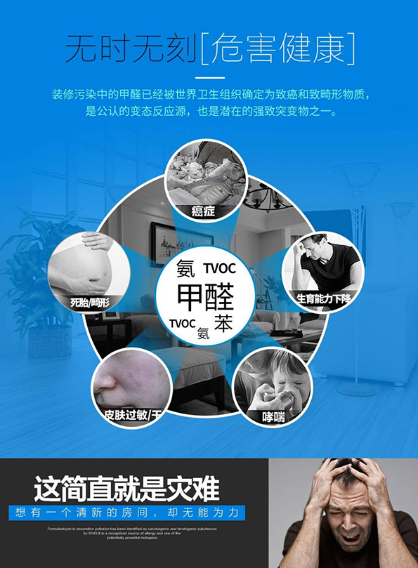 甲醛污染无时无刻不发生在每个人身边,新装修的公司,新装修的房屋,新的家具,一个人的一生中有80%的时间都暴露在含有甲醛的空气中。甲醛无时无刻不在危害我们的健康,也许当我们发现它带的危害时,已经产生了不可挽回的后果。